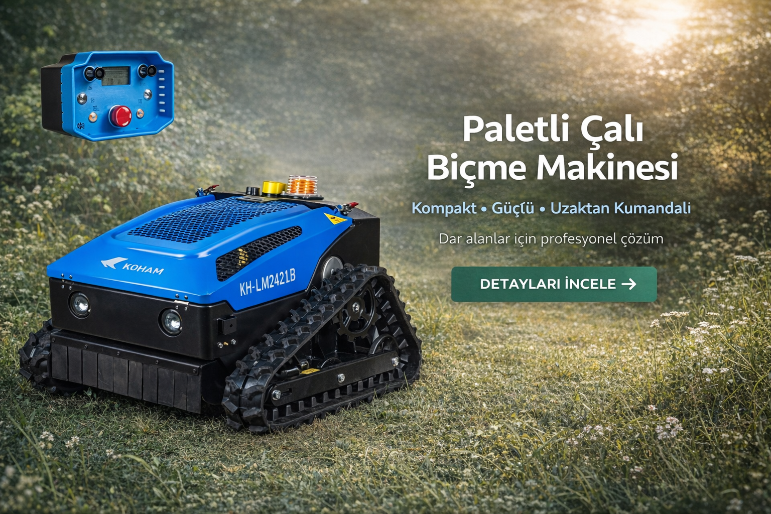 KOHAM KH-LM2421B Paletli Çalı ve Yabani Ot Biçme Makinesi, daha kompakt yapıda olmasına rağmen güçlü performans sunan profesyonel bir çözümdür. Özellikle dar alanlar, eğimli araziler ve yoğun bitki örtüsüne sahip bölgelerde etkili sonuç verir.